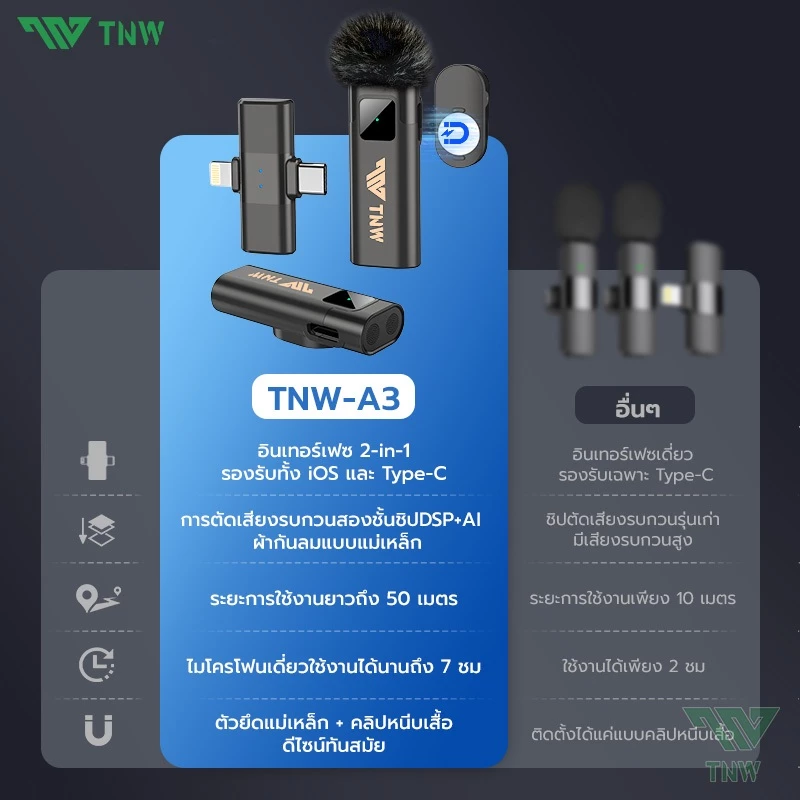 ไมโครโฟนไร้สาย TNW A2/A3 ถือเป็นหนึ่งในอุปกรณ์ที่มาแรงมากในกลุ่มครีเอเตอร์ ไลฟ์สด และผู้ที่ต้องการเสียงคมชัดแบบไม่ต้องพึ่งอุปกรณ์ราคาแพง จุดเด่นของรุ่นนี้คือ “2‑in‑1” ที่รองรับทั้ง iOS และ Type‑C ในตัวเดียว ทำให้ใช้งานง่ายสุด ๆ ไม่ต้องซื้อหลายแบบให้ยุ่งยาก
